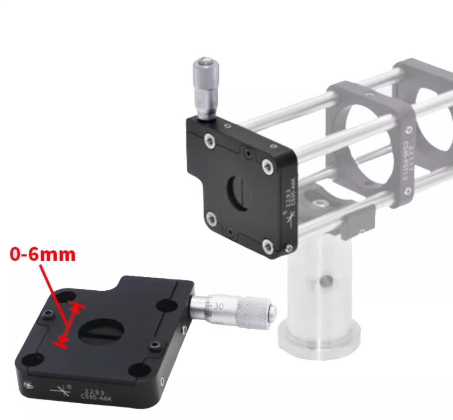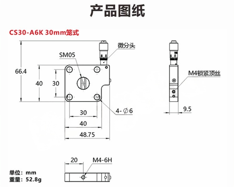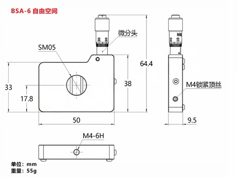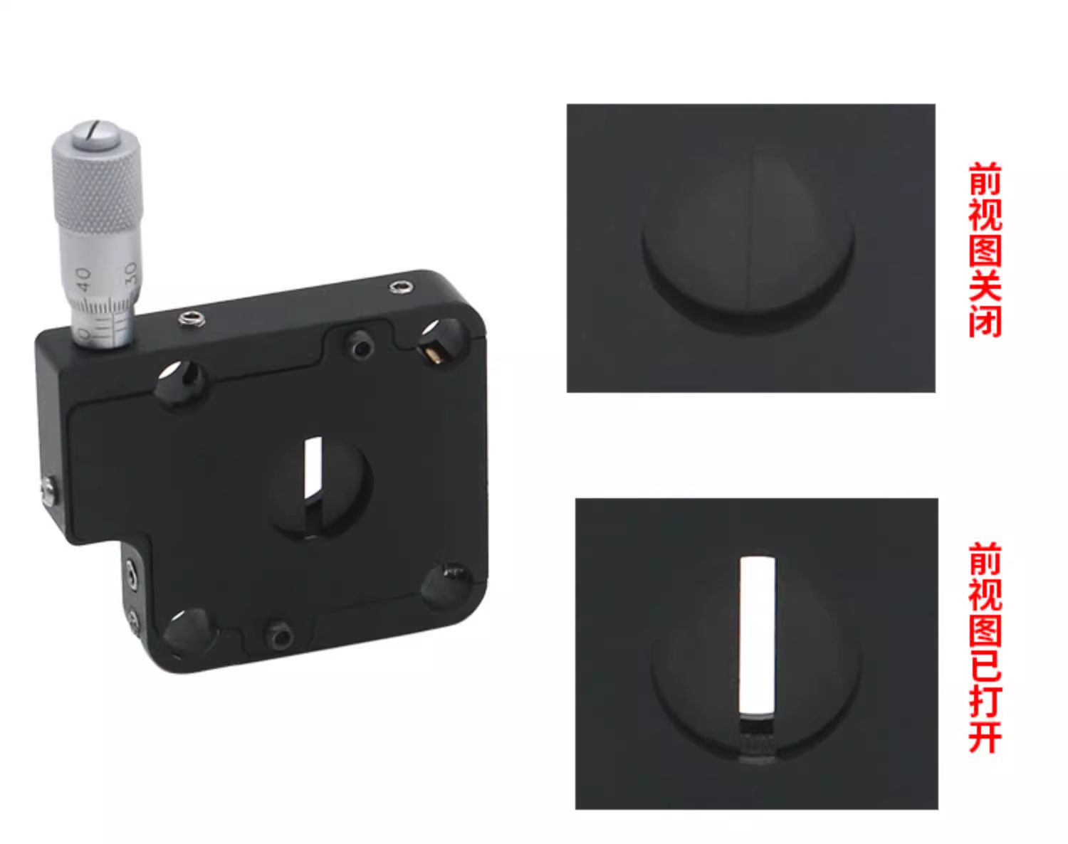 可调狭缝整体采用铝合金材质制成,表面黑色阳极氧化,与30mm笼式相容;狭缝的外壳有四个Ø6mm通孔,用于6mm导杆;每根导杆通过后用(2.0mm)六角扳手拧紧固定螺丝锁定。安装在笼式系统中时,这些通孔便于将狭缝定位在竖直或水平方向 精密测微头调节狭缝宽度。狭缝可调宽度:0.00英寸到0.24英寸(0.0 mm到6.0 mm)。SM05(0.535"-40)内螺纹,用于连接透镜套管。竖直或水平方向上兼容30mm笼式系统