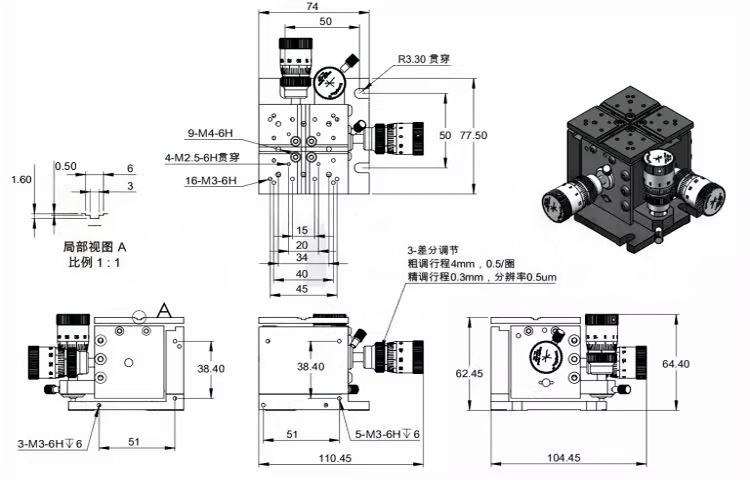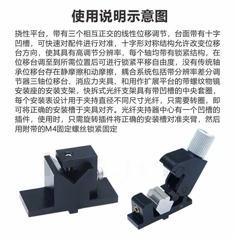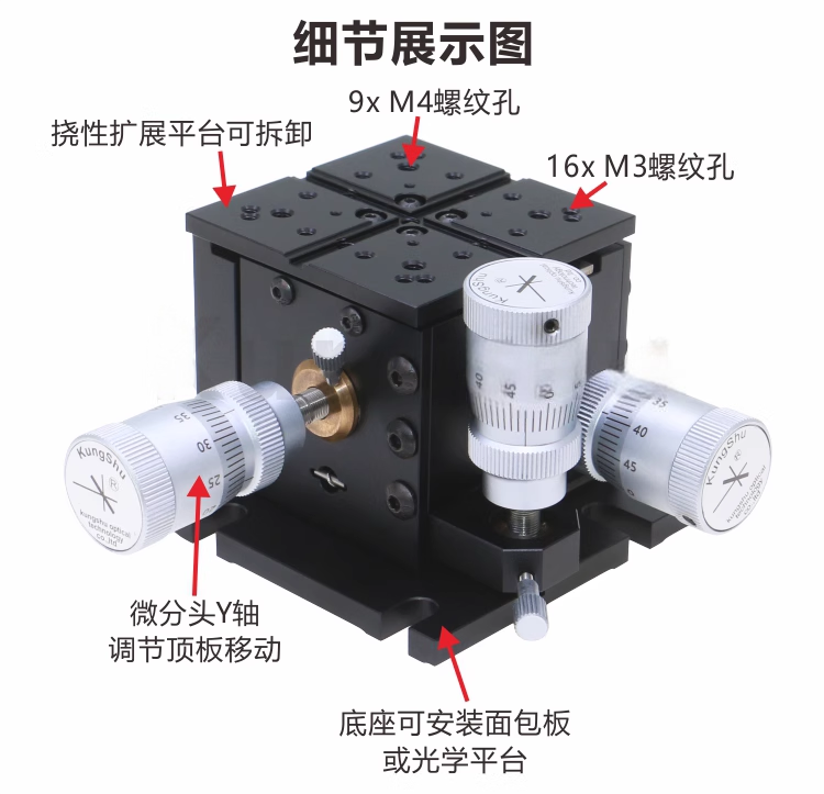 1-整体为铝合金材质制造 2-表面黑色阳极氧化处理 3-挠性对准平台行程为4mm 4-挠性设计,不需要润滑油,提高长期稳定性确保平滑连续运动和长期稳定 性 5-所有调节器都耦合到底座,将串扰降到最低 6-底座具有安装槽,用于安装到面包板和光学平台