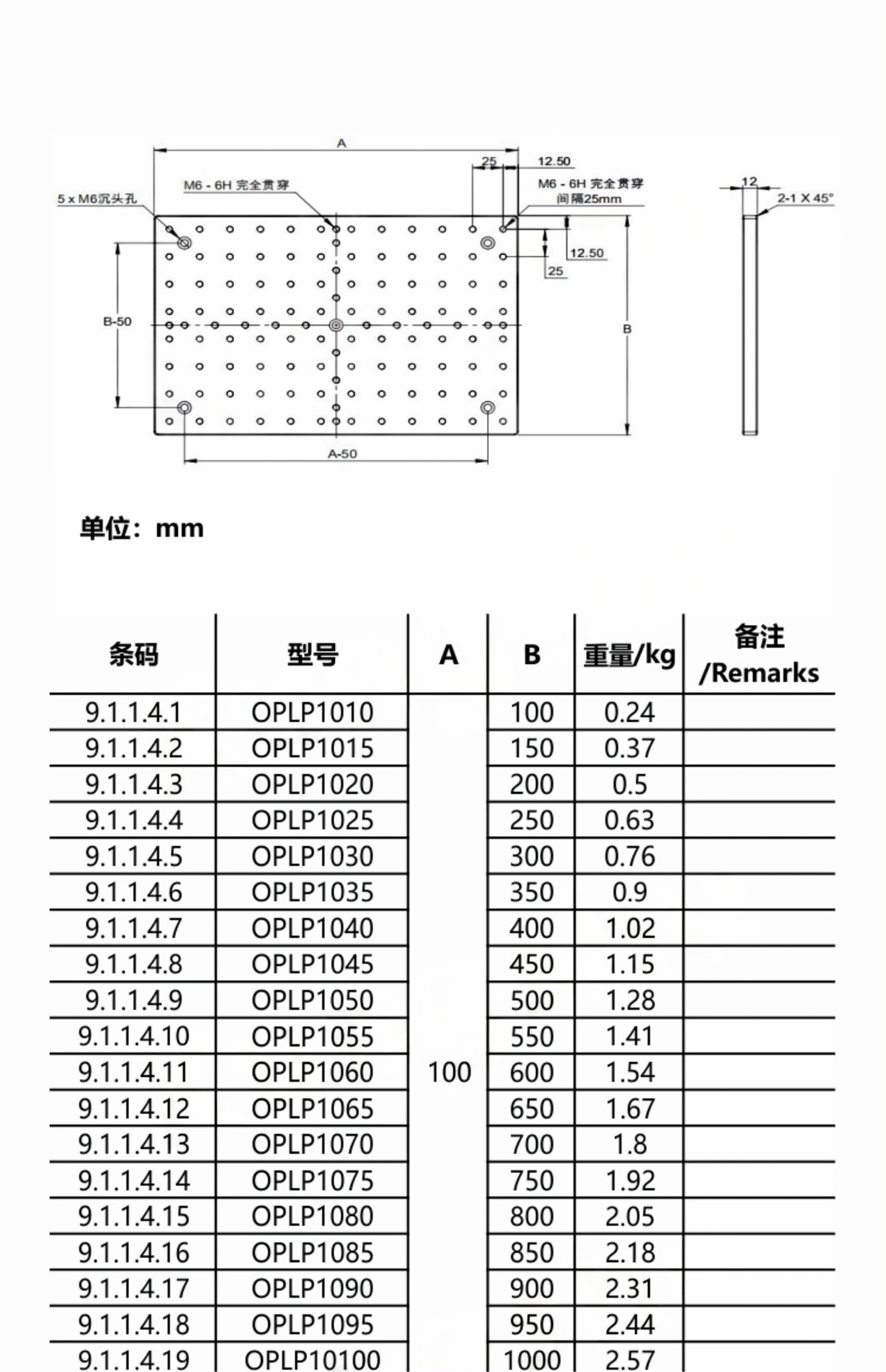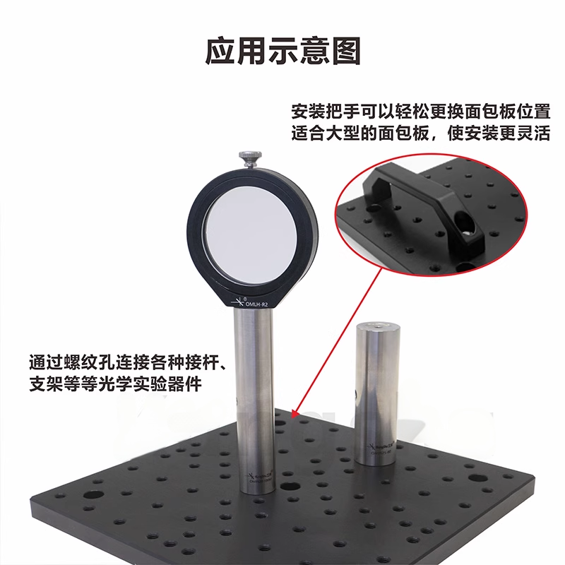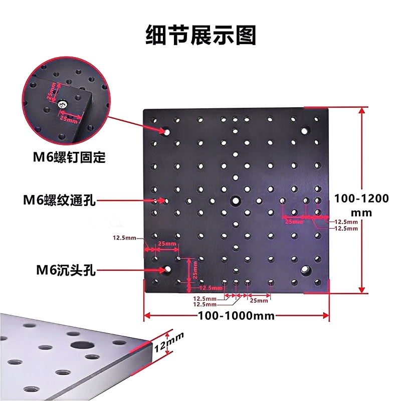 1-铝合金材质表面黑色阳极; 2-厚度均为12mm; 3-具有M6螺纹孔,孔间距为25mm。 4-四个角带有M6沉头孔,便于固定平台; 5-多种尺寸可选,支持定制。