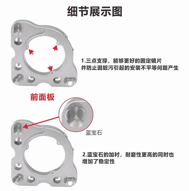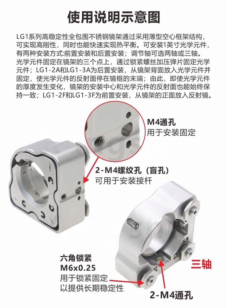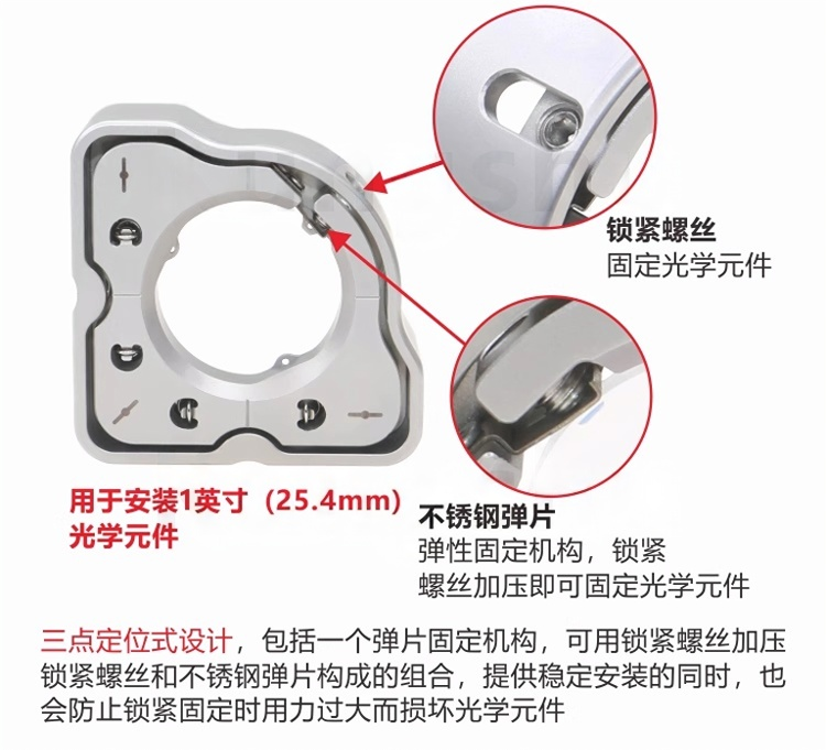 整体材料为不锈钢。可以实现高刚性,同时也可快速实现热平衡。光学元件固定在安装孔的三个点上,包含一个弹片固定机构,可使用锁紧螺丝加压。用于安装1英寸光学元件。两种安装方式:前置安装或后置安装调节轴可选两轴或三轴