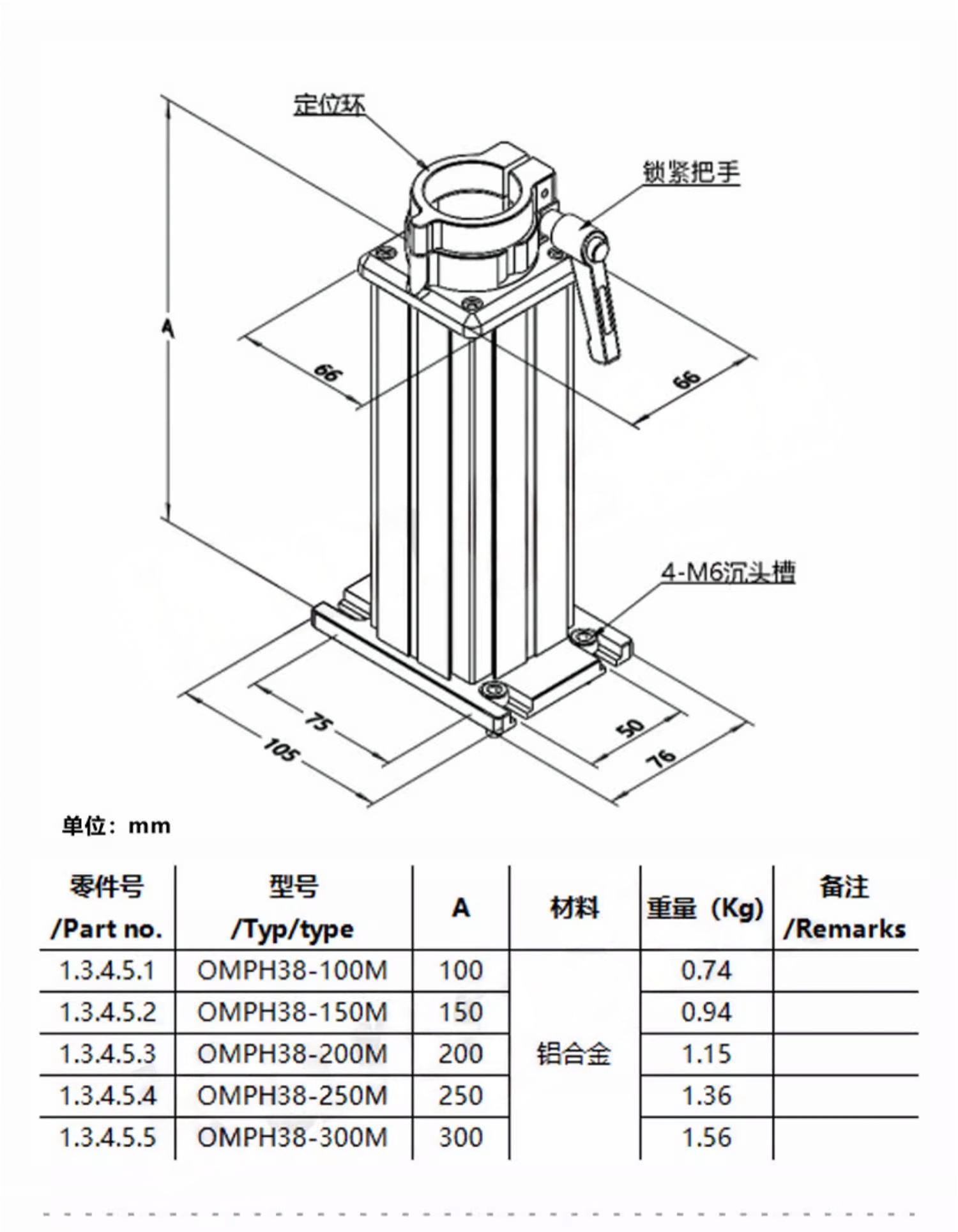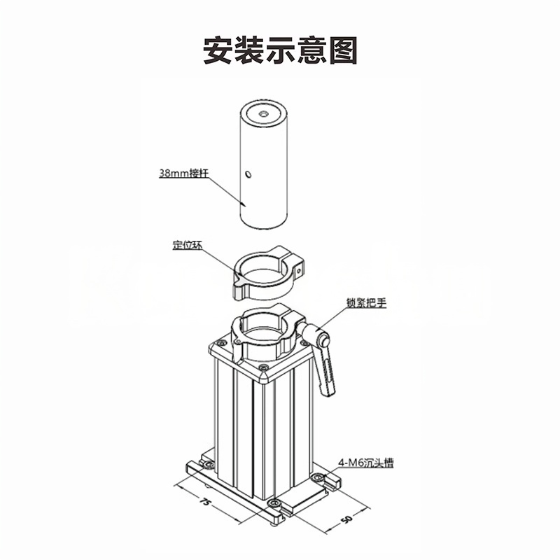 1-铝合金材质; 2-适用于38mm(1.5英寸)光学接杆的安装座 3-带有定位环,以方便能够快速的定位接杆的高度; 4-有5种高度可选。
