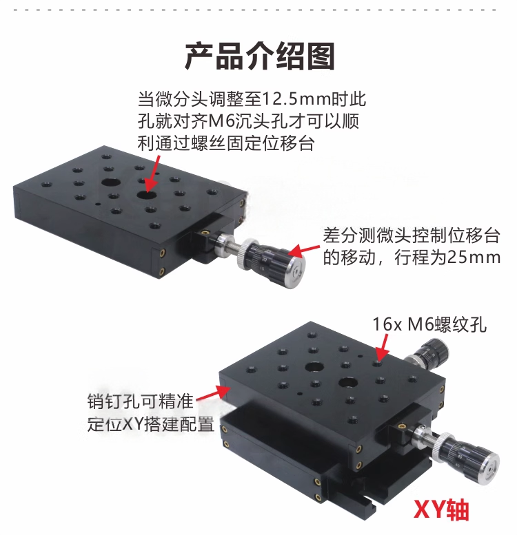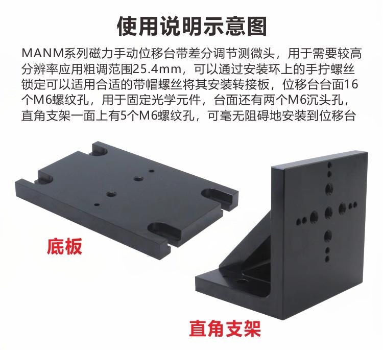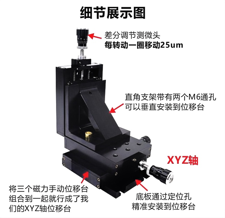 1-整体为铝合金材质制造 2-表面黑色阳极氧化处理 3-模块化设计便于将位移台组成XY或XYZ配置 4-16个M6螺纹安装孔,2个M6沉头孔可通过圆柱头螺丝将其固定到光学平台5-直角支架用于垂直安装;底板用于安装到光学平台 6-差动调节范围250um,每转动一圈移动25um,每隔0.5um就有一条刻度线7-MANM-25XYZ位移台带有差分测微头,可用于需要较高分辨率的应用