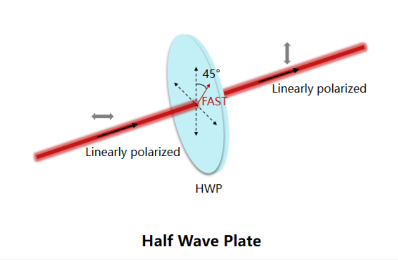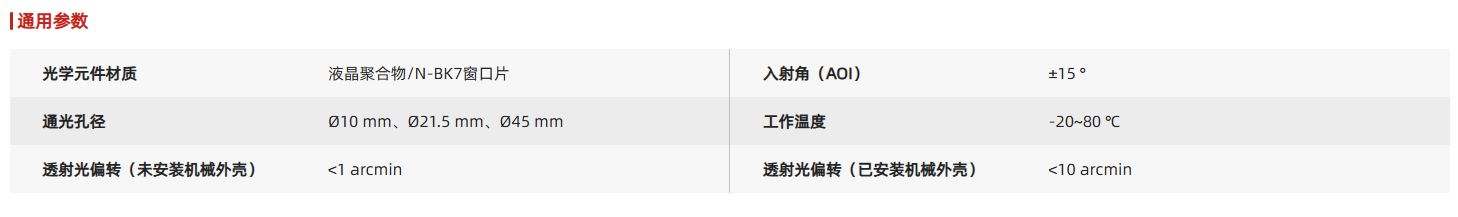 聚合物真零级二分之一波片基于N-BK7玻璃基底和液晶聚合物双折射材料,通过精确控制液晶聚合物薄膜的厚度便可以精确控制o光(垂直于光轴)和e光(平行于光轴)在经过晶体时产生π的相位差,从而得到λ/2延迟量。未安装机械外壳的聚合物真零级二分之一波片,Ø25.4 mm和Ø50.8 mm波片采用D型切边设计且快轴方向与切边平行,Ø12.7 mm波片无切边以侧面划线方式标示快轴方向,方便客户快速辨别使用。