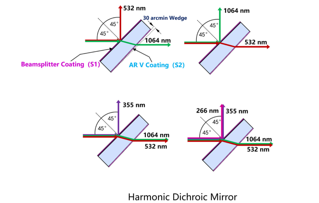 Nd:YAG谐波分光镜可用于分离Nd:YAG激光谐波,Nd:YAG激光谐波,即可保证减少反射光干涉,也可用于偏转特定波长的光束,提供四种波长配置可选。