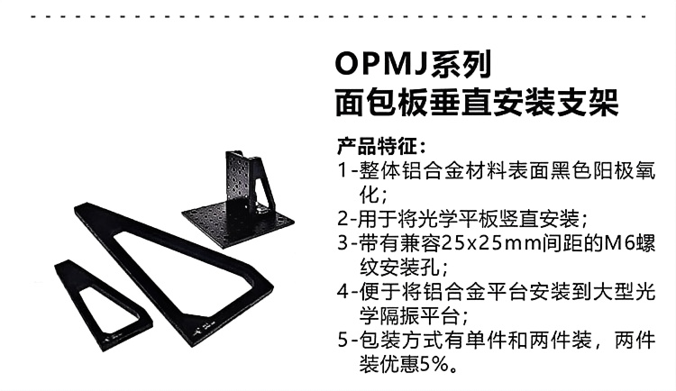 1-整体铝合金材料表面黑色阳极氧化; 2-用于将光学平板竖直安装 3-带有兼容25x25mm间距的M6螺纹安装孔; 4-便于将铝合金平台安装到大型光学隔振平台; 5-包装方式有单件和两件装,两件装优惠5%。