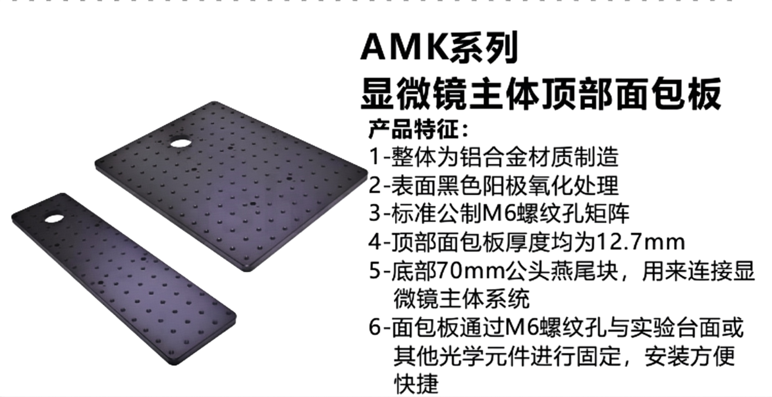 1-整体为铝合金材质制造 2-表面黑色阳极氧化处理 3-标准公制M6螺纹孔矩阵 4-顶部面包板厚度均为12.7mm 5-底部70mm公头燕尾块,用来连接显微镜主体系统 6-面包板通过M6螺纹孔与实验台面或其他光学元件进行固定,安装方便快捷